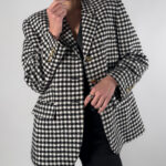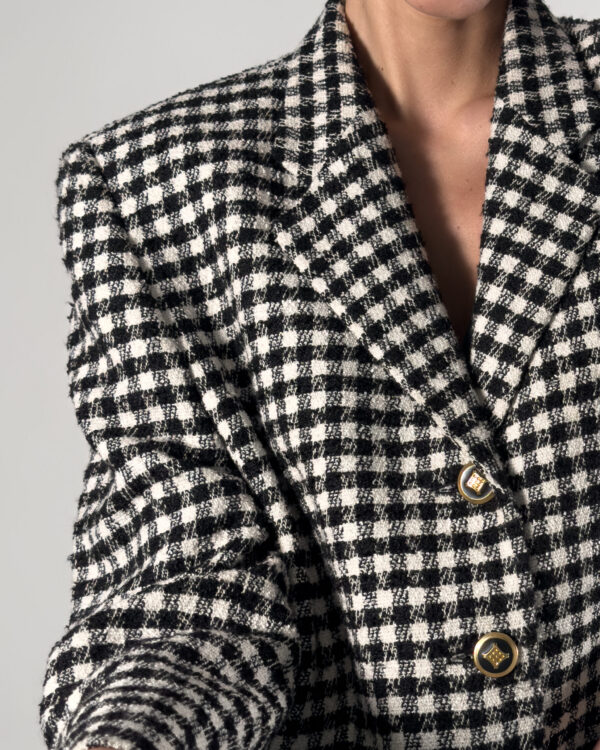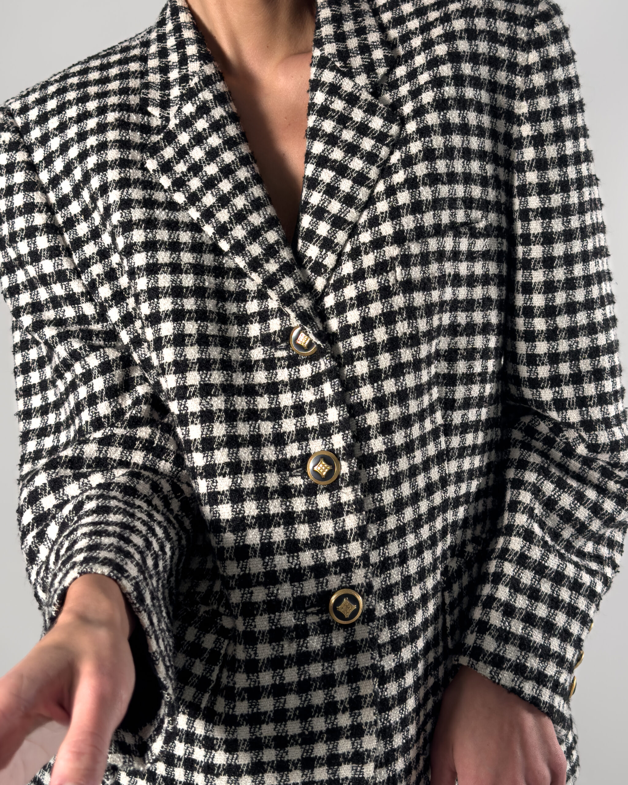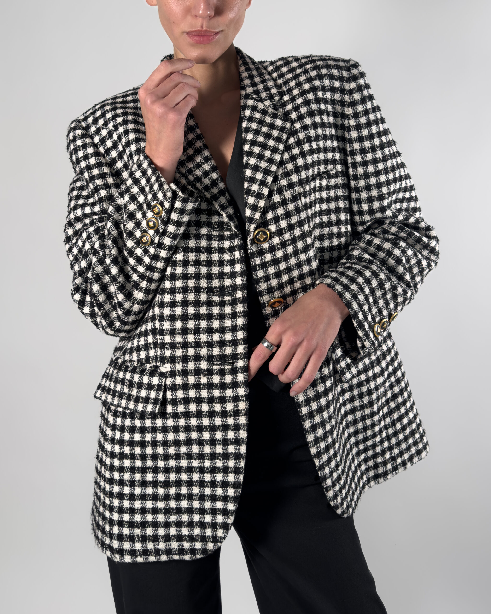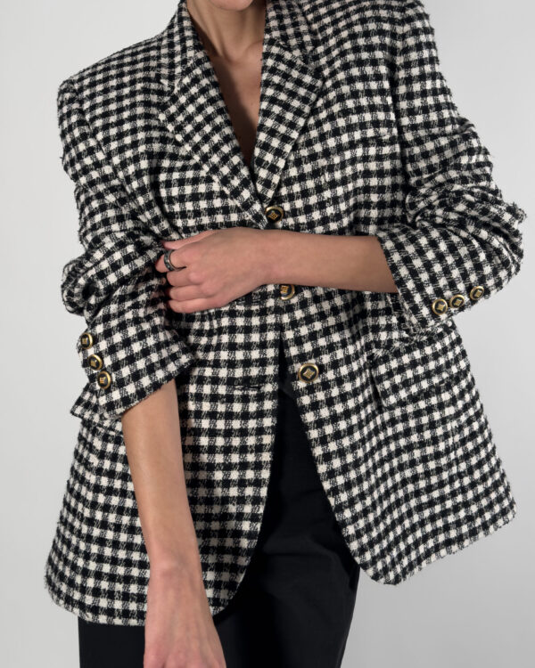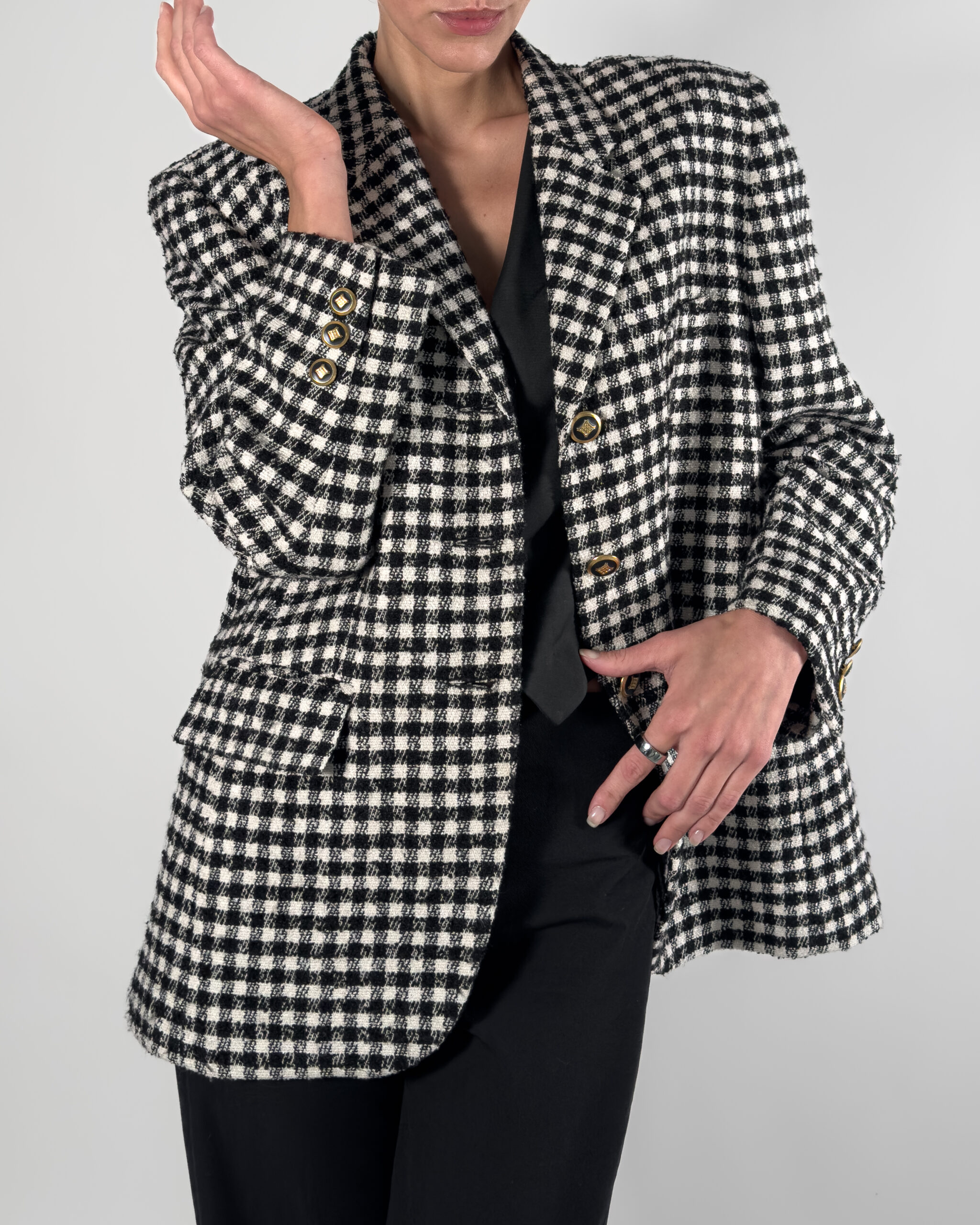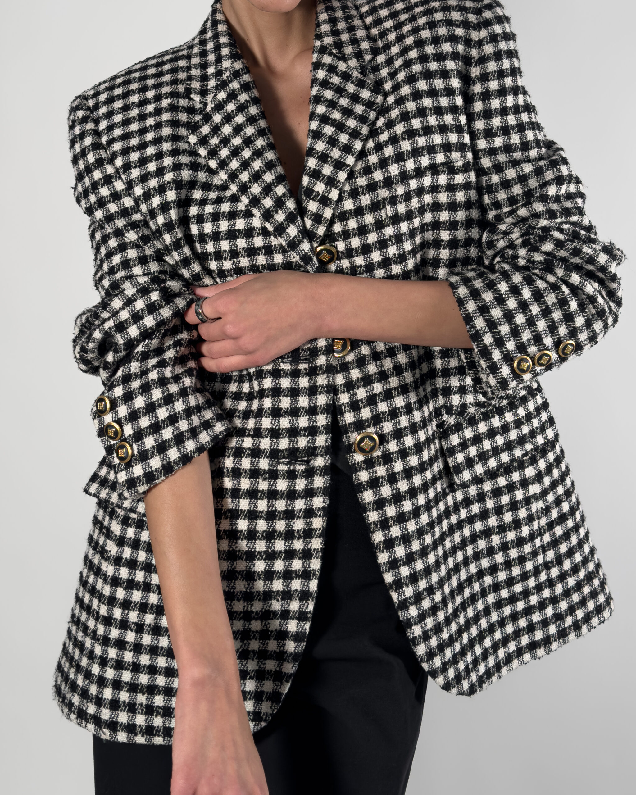 Wool blend gold-buttoned statement blazer. Structured silhouette with shoulder pads.