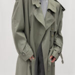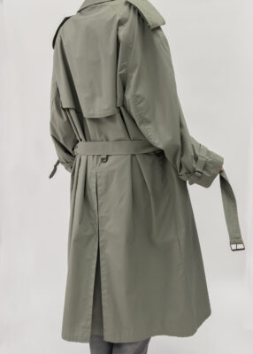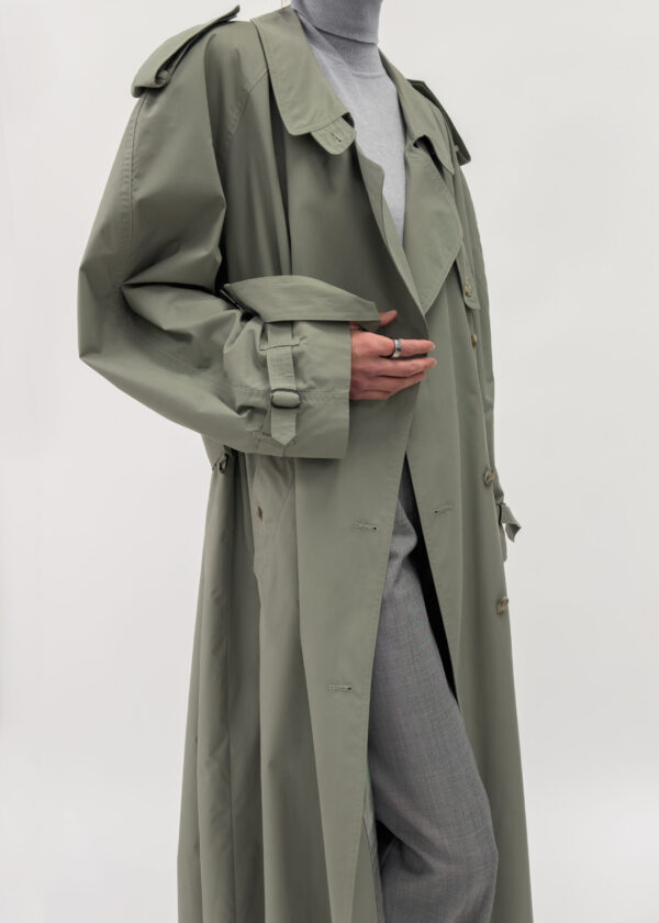 90’s Vintage classic trench coat in light green, this unisex street style-inspired coat takes its inspiration from vintage shapes. Amazing vintage piece with a modern vibe. In excellent condition.