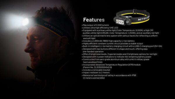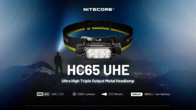 The NITECORE HC65 UHE is an ultra-high efficiency triple-output metal headlamp designed for serious outdoor enthusiasts and professionals. It stands out with its innovative 8-core UHE (Ultra High Efficiency) LED system, delivering a powerful 2000 lumens of primary white light with impressive throw (up to 222 meters) and a wide, even flood.