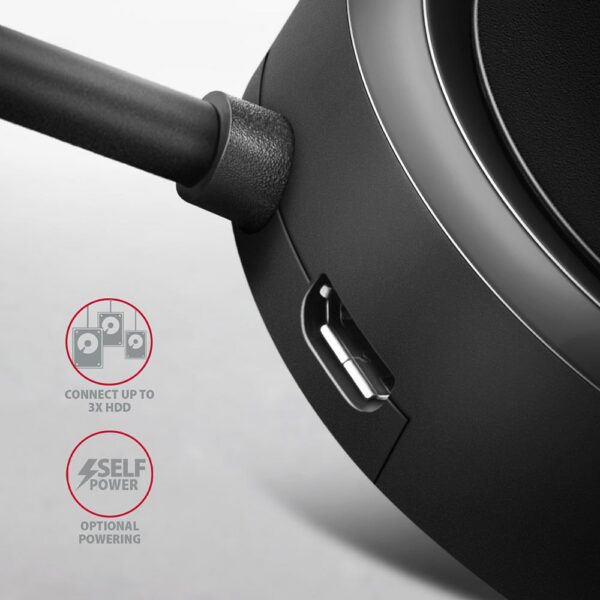 The versatility of this USB hub is also enhanced by the built-in micro USB connector for additional power from standard USB chargers supplied with mobile phones. Thanks to this additional power supply several external disks can be connected to a computer, laptop, tablet or smartphone. The USB 3.2 Gen 1 standard enables transfer speeds of up to 5Gb/s. The hub will also charge phones and tablets with a current up to 1.5A/5V. So hub can easily charge an Android smartphone, Apple iPhone, Apple iPad etc.
