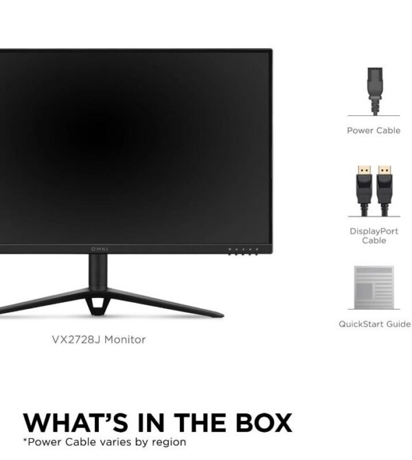 The ViewSonic OMNI™ VX2728J is a 27” Full HD IPS monitor built with the speed and performance that gamers need. Featuring a 165Hz refresh rate and AMD FreeSync™ Premium technology, this monitor virtually eliminates screen tearing and stuttering for fluid game play during fast-paced action scenes. An ultra-fast 0.5ms (MPRT) response time also provides smooth screen performance free from blurring or ghosting. A fully adjustable ergonomic stand and a three-sided borderless design maximizes viewing size and an optimized set-up while minimizing frame distractions. Flexible connectivity options such as DisplayPort and HDMI allow you to connect to your PC and gaming console.