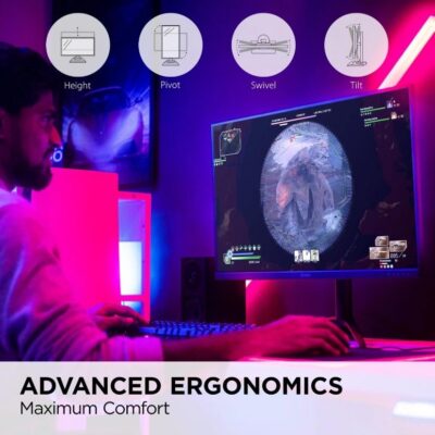 This monitor features a fully adjustable ergonomic stand capable of considerable swivel, pivot, tilt, and height adjustment. The stand is also designed with a cable management feature that helps reduce clutter around your gaming space.