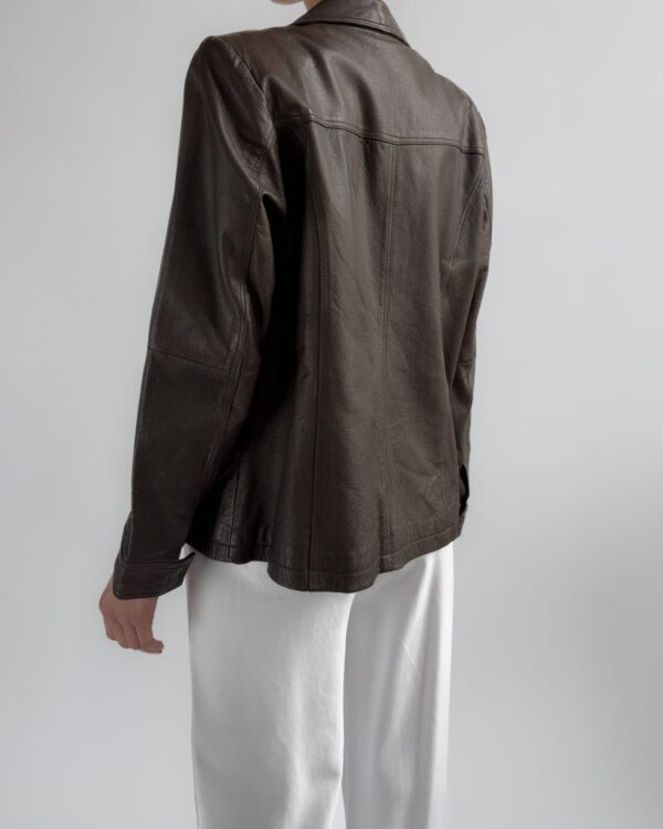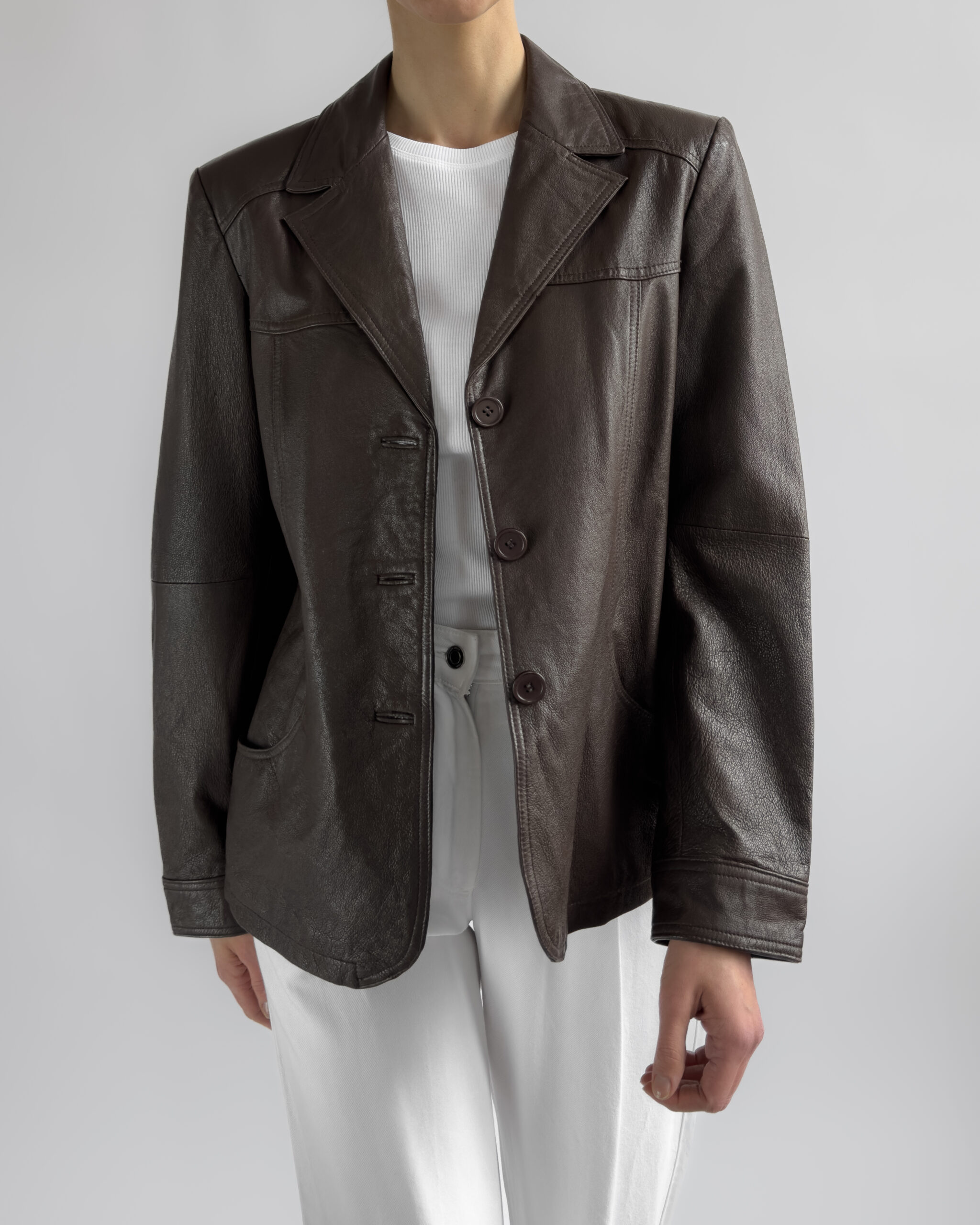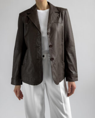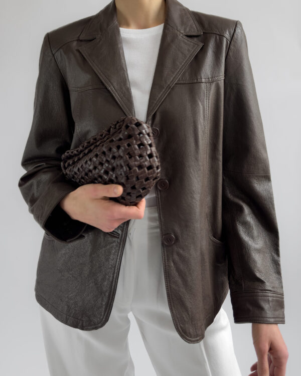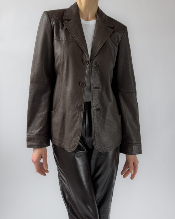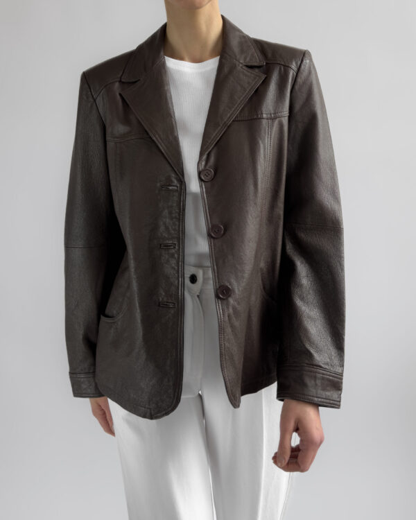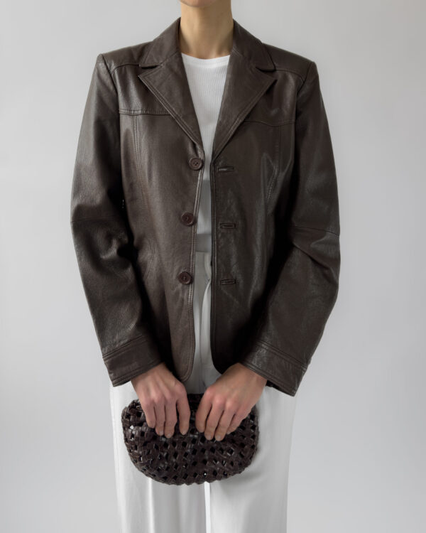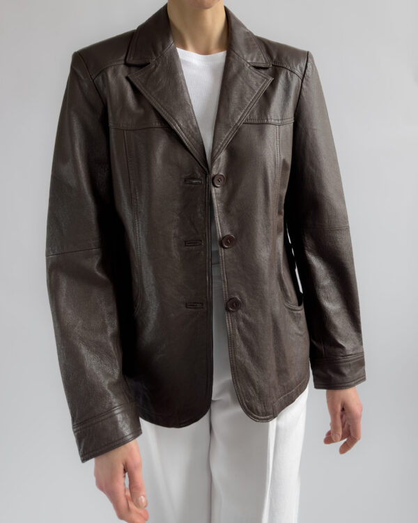 This structured blazer from Friendtex is made from smooth mocha brown leather and lined with a silky brown fabric. A clean silhouette with classic lapels, three-button front and subtle waist shaping.
