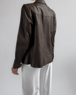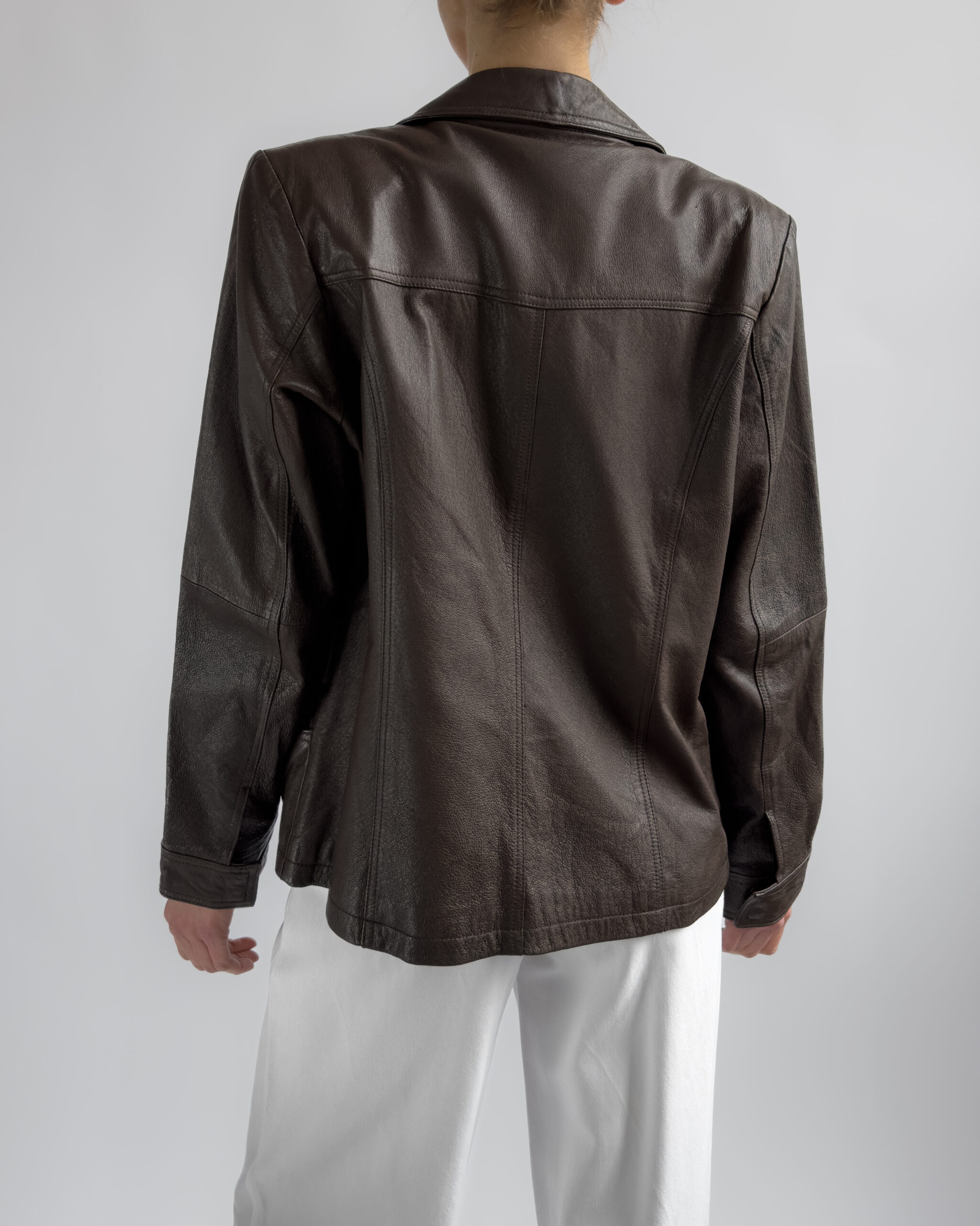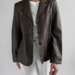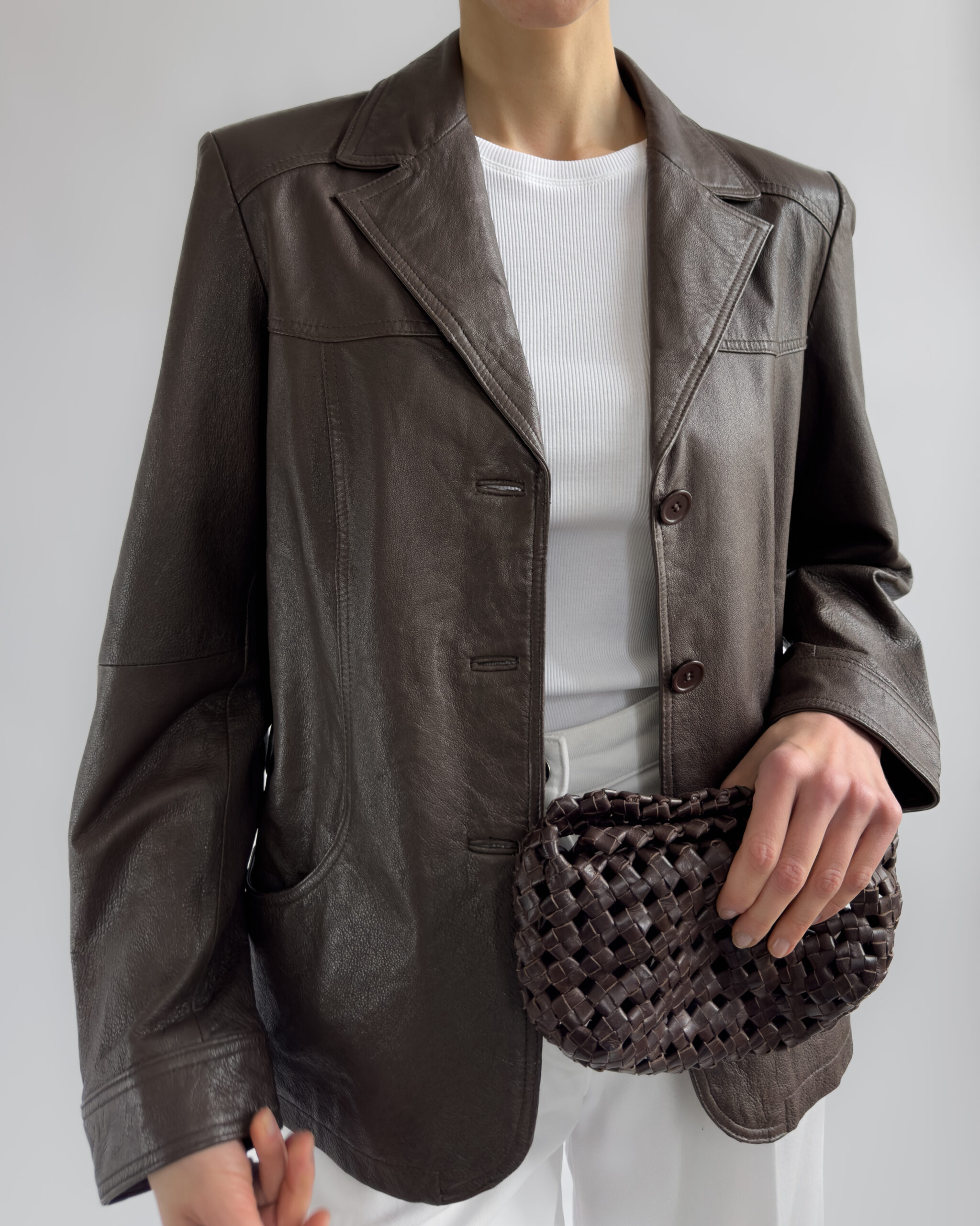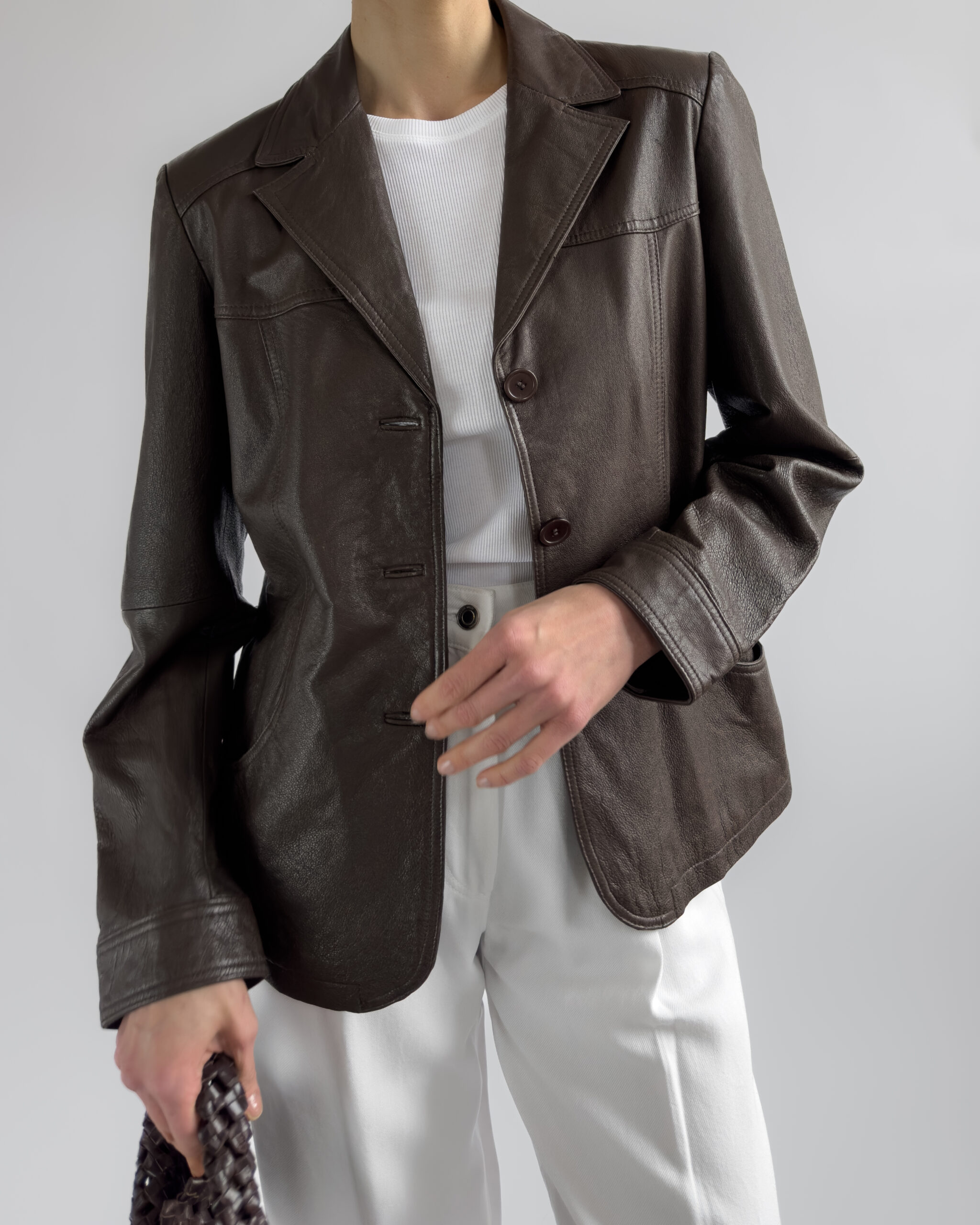 This structured blazer from Friendtex is made from smooth mocha brown leather and lined with a silky brown fabric. A clean silhouette with classic lapels, three-button front and subtle waist shaping.