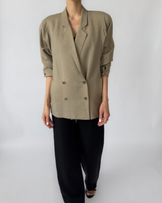 Double-breasted linen jacket in a muted olive green tone. Features a classic button-up closure, subtle shoulder pads, two front pockets, and a silky viscose lining for comfort. Elegant and versatile, perfect for layering in any season.