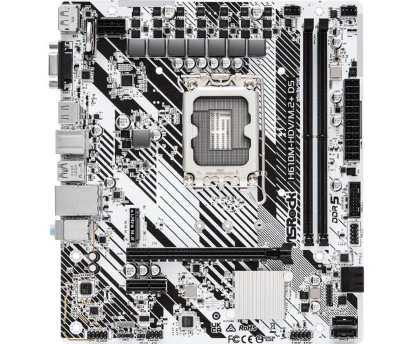 Intel H610 | LGA1700 | Micro-ATX | DDR5 | 5600/5500/5400/5333/5300/5200/5133/5100/5066/5000/4933/4866/4800 MHz | Memory slots 2 | Video Depending on CPU | LAN Gigabit | Audio Realtek ALC897 | TPM Header