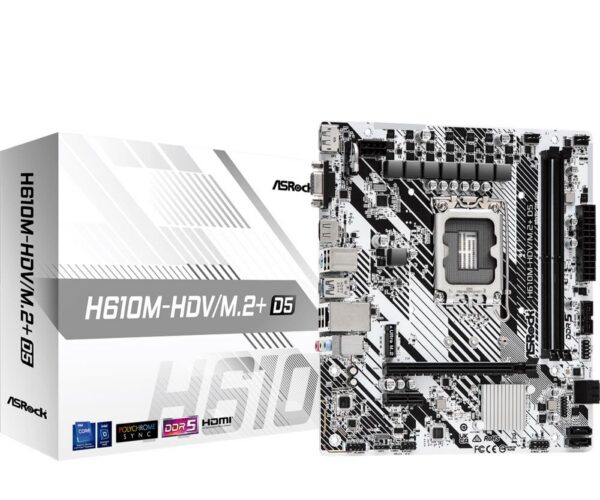 Mainboard|ASROCK|Intel H610|LGA1700|Micro-ATX|Memory DDR5|Memory slots 2|1xPCI-Express 3.0 1x|1xPCI-Express 4.0 16x|1xM.2|1x15pin D-sub|1xHDMI|1xDisplayPort|1xAudio-In|1xAudio-Out|1xMicrophone|4xUSB 2.0|1xUSB 3.2|1xUSB-C|1xPS/2|1xRJ45|H610M-HDV/M.2+D5