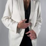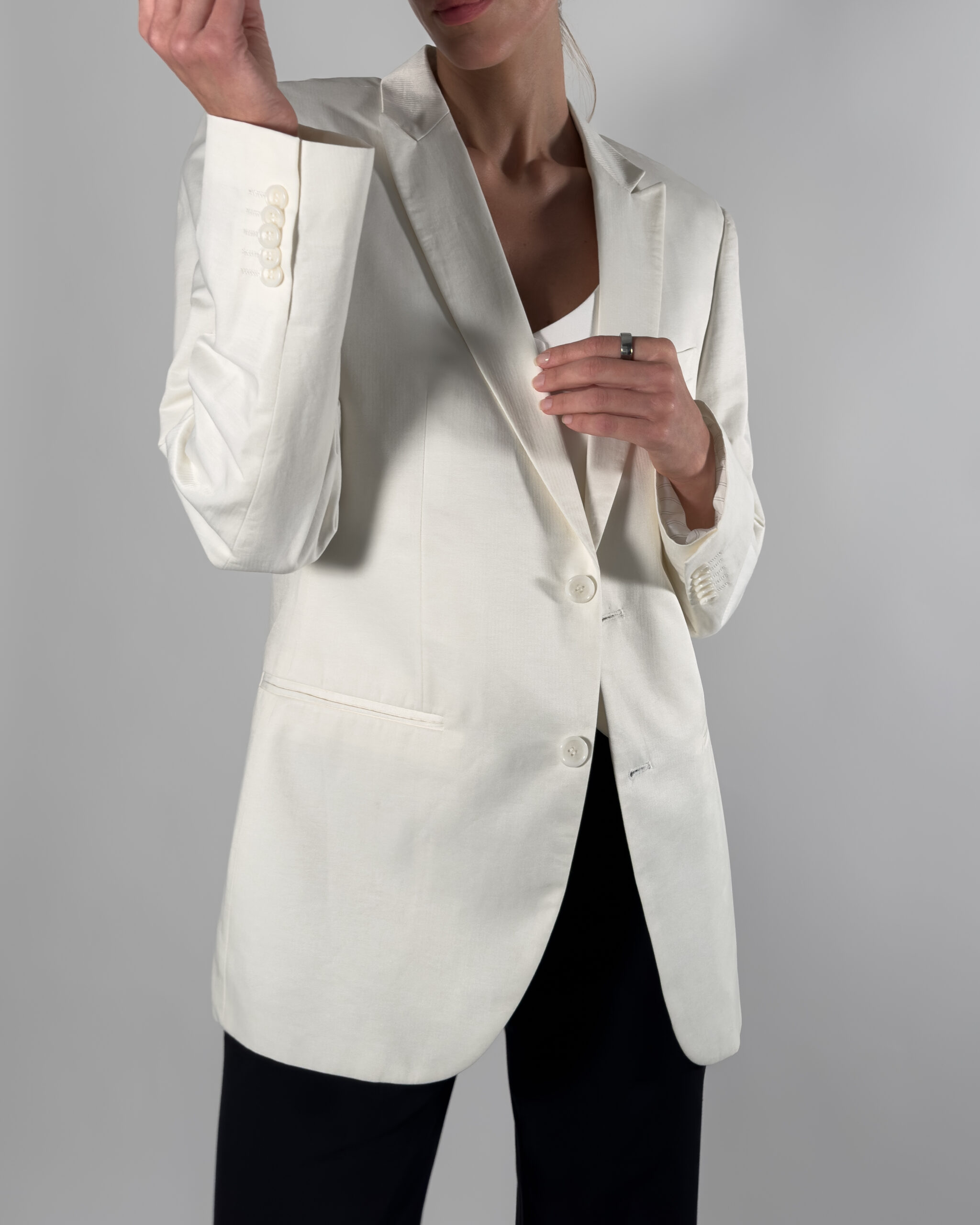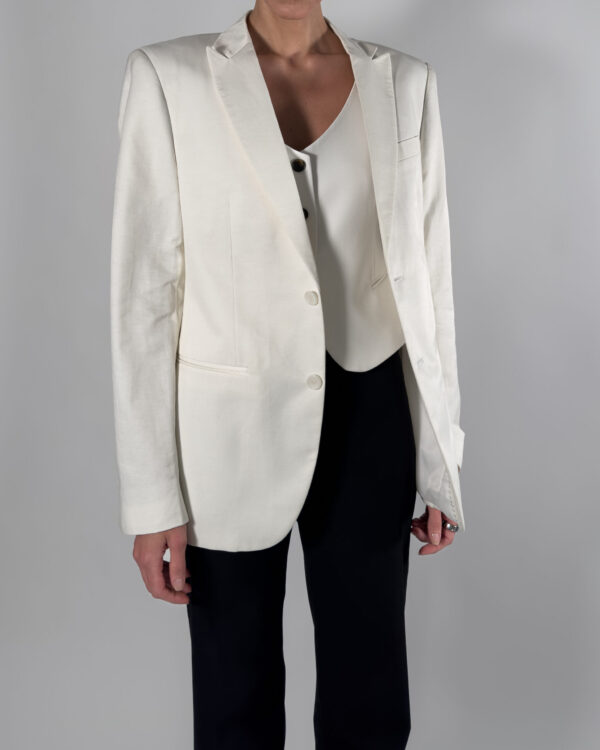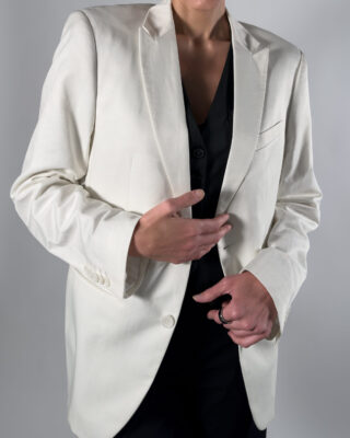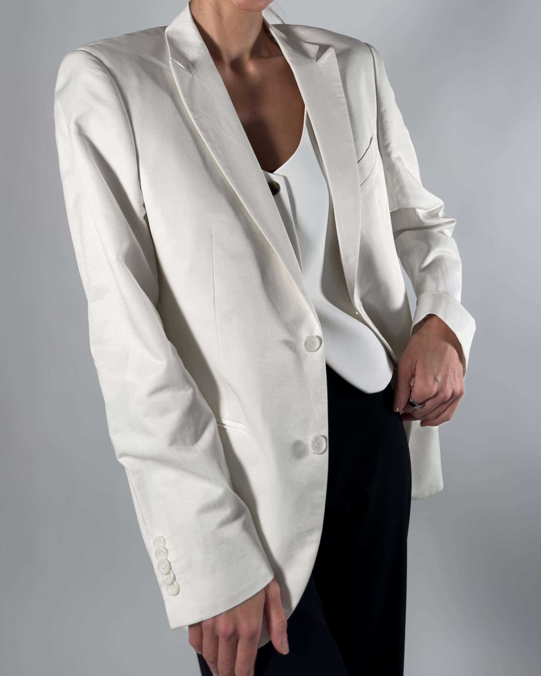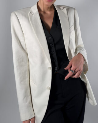 Silky unisex suit blazer in cream white. By Andre Bertani, size 50. This blazer features shoulder pads, button up closure and inner pockets.